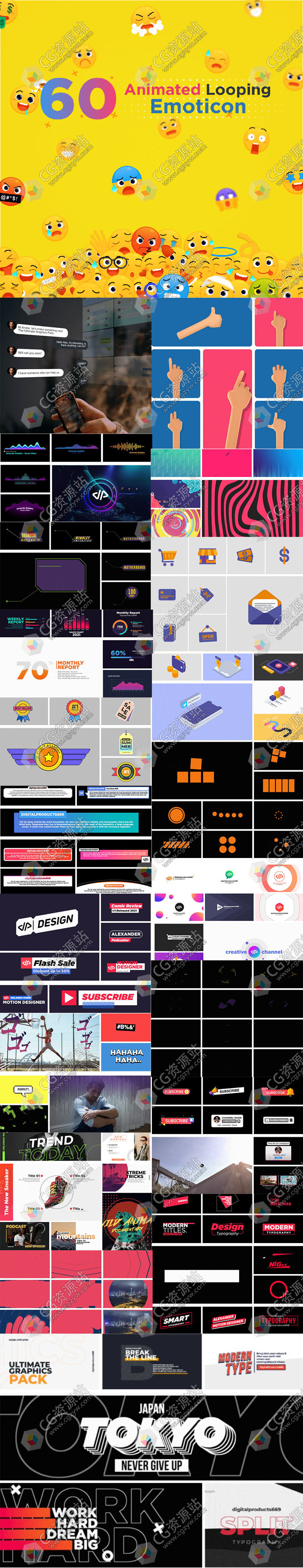 超过 525 个超级易用的图形元素,整齐地组织在 21 个类别中。完美的视觉效果,让您的视频不仅脱颖而出,为所有创作者和编辑英雄提供的最好和最完整的包:终极图形包!60个表情 ,10个泡泡聊天,20个手势,10个音频频谱,20个背景,20个呼叫指示线,90个平面图标,20个信息图表,10个等距,20个图标徽章 ,20个信息栏,15个加载图标,20个标志展示,20个字幕条,30个运动形状,10个叠加,35个促销品,30个幻灯片,30个标题,20个过渡,20个排版,文章源自CG资源站-https://www.cgzyw.com/54296.html